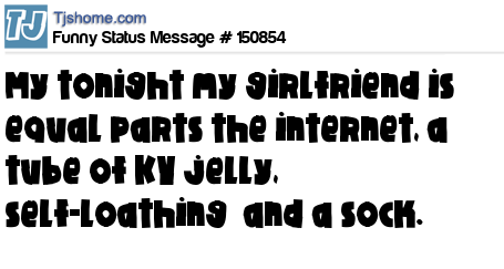 X says My tonight my girlfriend is equal parts the internet, a tube of KY jelly, self-loathing and a sock.