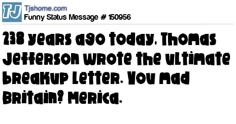 X says 238 years ago today, Thomas Jefferson wrote the ultimate breakup letter. You mad Britain? Merica.