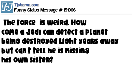 - # 80306 "The Force" is weird. How come a Jedi can detect a planet being destroyed light years away but can't tell he is kissing his own sister?