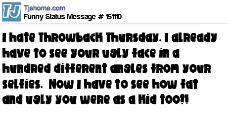 X says I hate Throwback Thursday. I already have to see your ugly face in a hundred different angles from your selfies. Now I have to see how fat and ugly you were as a kid too?!