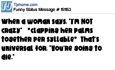 X says When a woman says, "I'm NOT crazy" *clapping her palms together per syllable* That's universal for, "You're going to die."