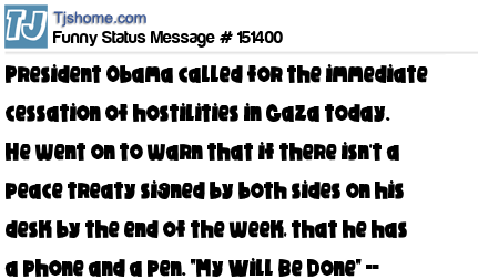 X President Obama called for the immediate cessation of hostilities in Gaza today. He went on to warn that if there isn't a peace treaty signed by both sides on his desk by the end of the week, that he has a phone and a pen. "My Will Be Done" -- B. Hussein