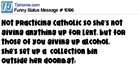 X is not practicing Catholic so she's not giving anything up for Lent, but for those of you giving up alcohol, she's set up a collection bin outside her door>