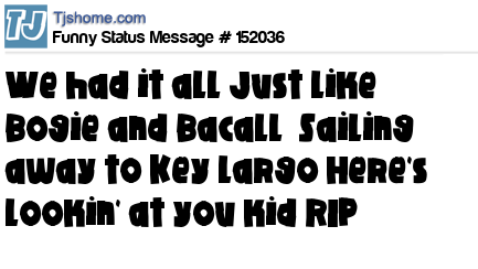 X We had it all Just like Bogie and Bacall Sailing away to Key Largo Here's lookin' at you kid RIP