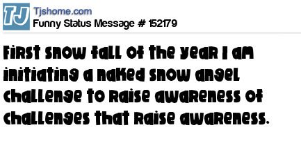X says first snow fall of the year I am initiating a naked snow angel challenge to raise awareness of challenges that raise awareness.