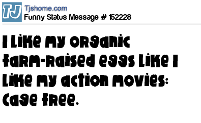 X says I like my organic farm-raised eggs like I like my action movies: Cage free.