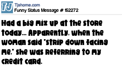 - # 183459 had a mix up at the store today when the cashier asked me to strip down facing her she apparently was talking about my debit card..