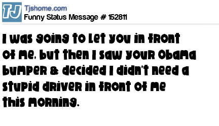 X says I was going to let you in front of me, but then I saw your Obama bumper & decided I didn't need a stupid driver in front of me this morning.