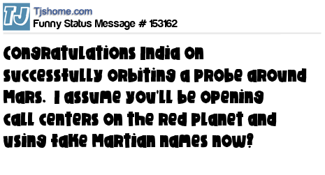 X says Congratulations India on successfully orbiting a probe around Mars. I assume you'll be opening call centers on the red planet and using fake Martian names now?