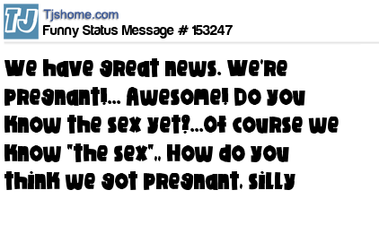 X We have great news. We're pregnant!... Awesome! Do you know the sex yet?...Of course we know "the sex",, How do you think we got pregnant, silly