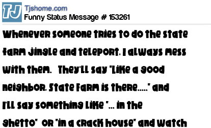 X Whenever someone tries to do the state farm jingle and teleport, I always mess with them. They'll say "Like a good neighbor, State Farm is there....." and I'll say something like "... in the ghetto" or "in a crack house" and watch the fun.
