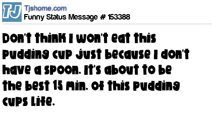 X says Don't think I won't eat this pudding cup just because I don't have a spoon. It's about to be the best 15 min. of this pudding cups life.