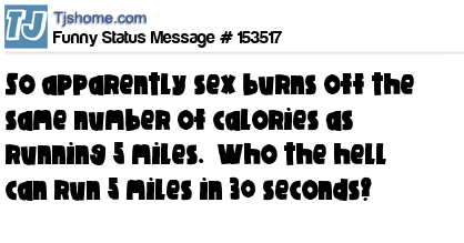 - # 88436 I just read that having sex burns just as much calories as running 4 miles. Who the f@&k runs 4 miles in 30 seconds?
