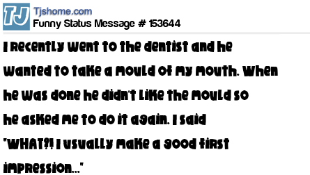 X says I recently went to the dentist and he wanted to take a mould of my mouth. When he was done he didn't like the mould so he asked me to do it again. I said "WHAT?! I usually make a good first impression..."