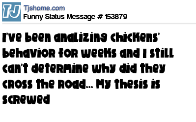 X says I've been analizing chickens' behavior for weeks and I still can't determine why did they cross the road... My thesis is screwed