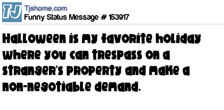 - # 172214 Halloween is my favorite holiday where you can trespass on a stranger's property and make a non-negotiable demand that includes a threat of vandalism.