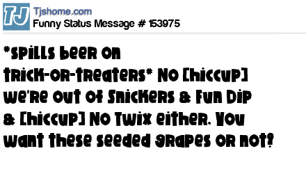 X says *spills beer on trick-or-treaters* No [hiccup] we're out of Snickers & Fun Dip & [hiccup] No Twix either. You want these seeded grapes or not?