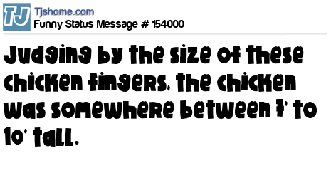 X says Judging by the size of these chicken fingers, the chicken was somewhere between 7' to 10' tall.