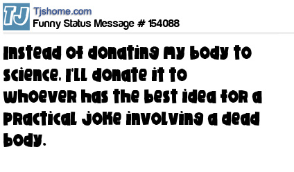 X says Instead of donating my body to science, I'll donate it to whoever has the best idea for a practical joke involving a dead body.