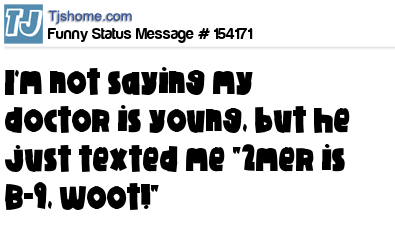 X says I'm not saying my doctor is young, but he just texted me "2mer is B-9, woot!"