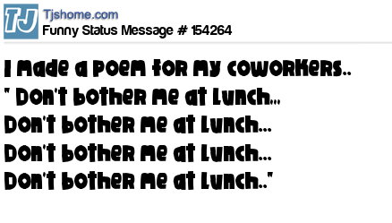 X I made a poem for my coworkers.. " Don't bother me at lunch,,, Don't bother me at lunch... Don't bother me at lunch... Don't bother me at lunch.."