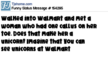 X says Walked into Walmart and met a woman who had one callus on her toe. Does that make her a unicorn? Imagine that You can see unicorns at Walmart