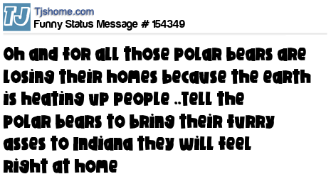 X Oh and for all those polar bears are losing their homes because the earth is heating up people ..Tell the polar bears to bring their furry asses to Indiana they will feel right at home