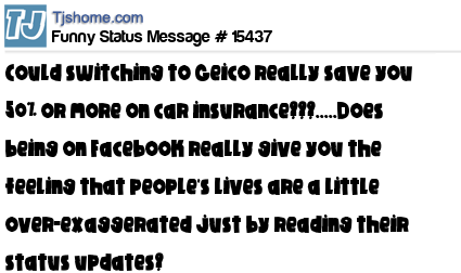 X Could switching to Geico really save you 50% or more on car insurance???.....Does being on Facebook really give you the feeling that people's lives are a little over-exaggerated just by reading their status updates?