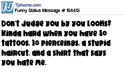 X says Don't judge you by you looks? Kinda hard when you have 50 tattoos, 30 pierceings, a stupid haircut, and a shirt that says you hate me.