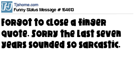 - # 166172 One time in 1997 I forgot to close my air quotes so everything I've said since then has been sarcastic.