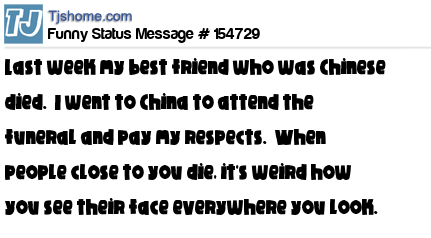 X says Last week my best friend who was Chinese died. I went to China to attend the funeral and pay my respects. When people close to you die, it's weird how you see their face everywhere you look.