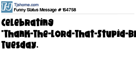 X Celebrating "Thank-The-Lord-That-Stupid-Brown-Thursday-Black-Friday-Cyber-Monday-Marketing-Crap-Is-Over" Tuesday.