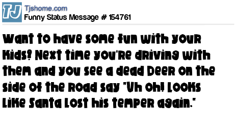 - # 153224 A cute thing I tell my kids when we see a dead deer on the side of the road is, "Looks like Santa lost his temper again."