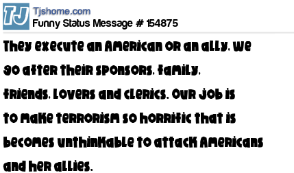 X says They execute an American or an ally, we go after their sponsors, family, friends, lovers and clerics. Our job is to make terrorism so horrific that is becomes unthinkable to attack Americans and her allies.