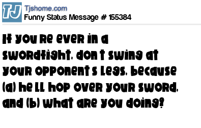 X says If you’re ever in a swordfight, don’t swing at your opponent’s legs, because (a) he’ll hop over your sword, and (b) what are you doing?