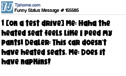 X says 1 [on a test drive] Me: Haha the heated seat feels like I peed my pants! Dealer: This car doesn't have heated seats. Me: Does it have napkins?