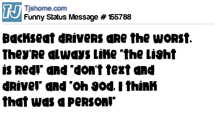 X says Backseat drivers are the worst. They're always like "the light is red!" and "don't text and drive!" and "oh god, I think that was a person!"