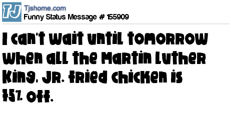 X says I can't wait until tomorrow when all the Martin Luther King, Jr. fried chicken is 75% off.