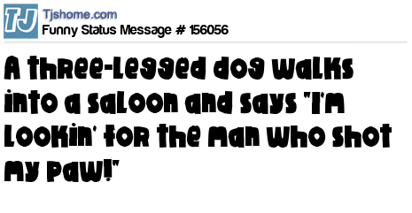 - # 118811 A three-legged dog walks into a saloon in the Old West. He slides up to the bar and announces: "I'm looking for the man who shot my paw."