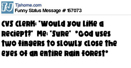 X says CVS Clerk: "Would you like a reciept?"  Me: "Sure"  *God uses two fingers to slowly close the eyes of an entire rain forest*