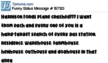 X says Harrison Fords plane crashed??? I want from each and every one of you is a hard-target search of every gas station, residence, warehouse, farmhouse, henhouse, outhouse and doghouse in that area