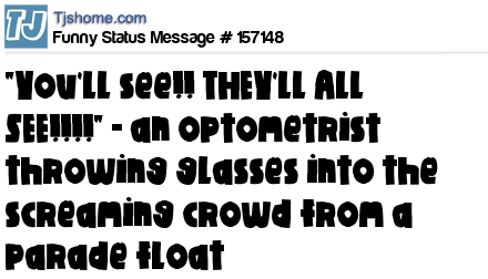 X "You'll see!! THEY'LL ALL SEE!!!!" - an optometrist throwing glasses into the screaming crowd from a parade float