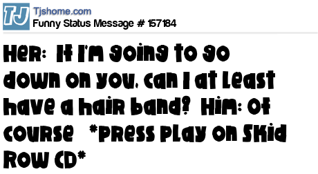 X says Her:  If I'm going to go down on you, can I at least have a hair band?  Him: Of course   *press play on Skid Row CD*