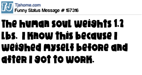 X says The human soul weights 1.2 lbs. I know this because I weighed myself before and after I got to work.