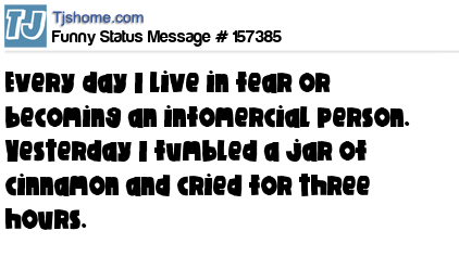 X says Every day I live in fear or becoming an infomercial person. Yesterday I fumbled a jar of cinnamon and cried for three hours.