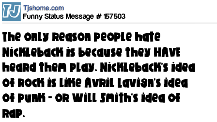 X says The only reason people hate Nickleback is because they HAVE heard them play. Nickleback's idea of rock is like Avril Lavign's idea of punk - or Will Smith's idea of rap.