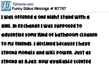 X says I was offered a one night stand with a girl. In exchange I was supposed to advertise some kind of bathroom cleaner to my friends. I declined because I have strong morals and will power. Just as strong as Ajax, now available scented with lemon or vanilla