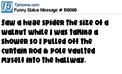 X says Saw a huge spider the size of a walnut while I was taking a shower so I pulled off the curtain rod & pole vaulted myself into the hallway.