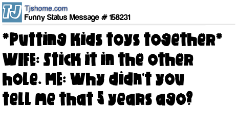 X says *Putting kids toys together* WIFE: Stick it in the other hole. ME: Why didn't you tell me that 5 years ago?