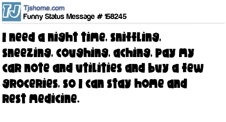 X says I need a night time, sniffling, sneezing, coughing, aching, pay my car note and utilities and buy a few groceries, so I can stay home and rest medicine.